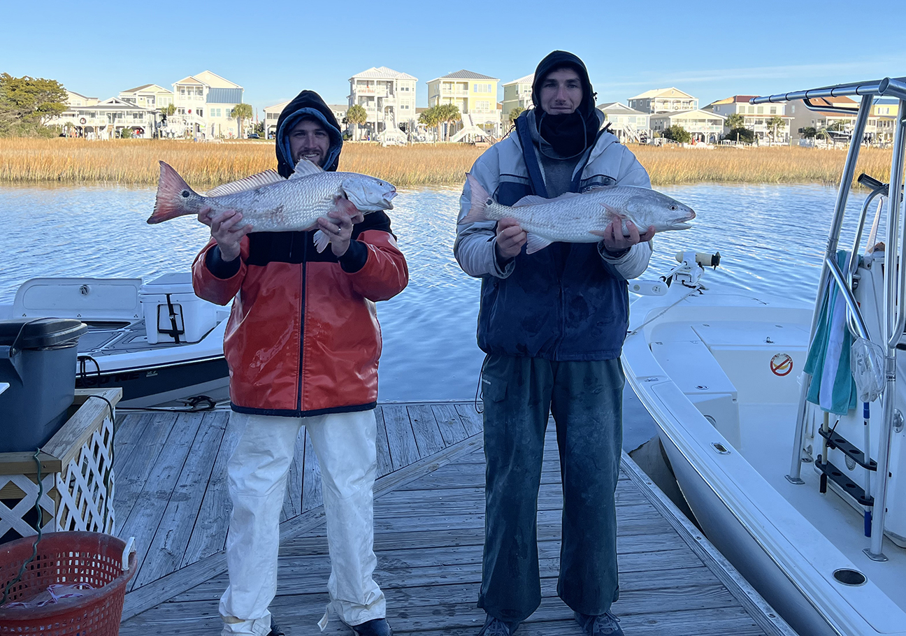 The crew worked docks and grass lines between Oak Island and Ocean Isle Beach, leaning heavily on bait to draw strikes in the frigid conditions. They rotated through live shrimp, cut bait, and even blue crabs, hoping the scent would coax fish to them rather than force the fish to chase lures in the cold water.