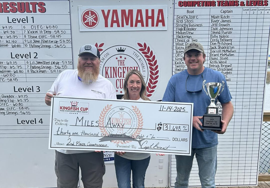Jason, Suzanne, and Hunter Miles, of Team Miles Away, with their $31,648 check for second place in the 2025 Kingfish Cup Championship. The family crew overcame engine trouble to weigh in two kings totaling 64.3 lbs.