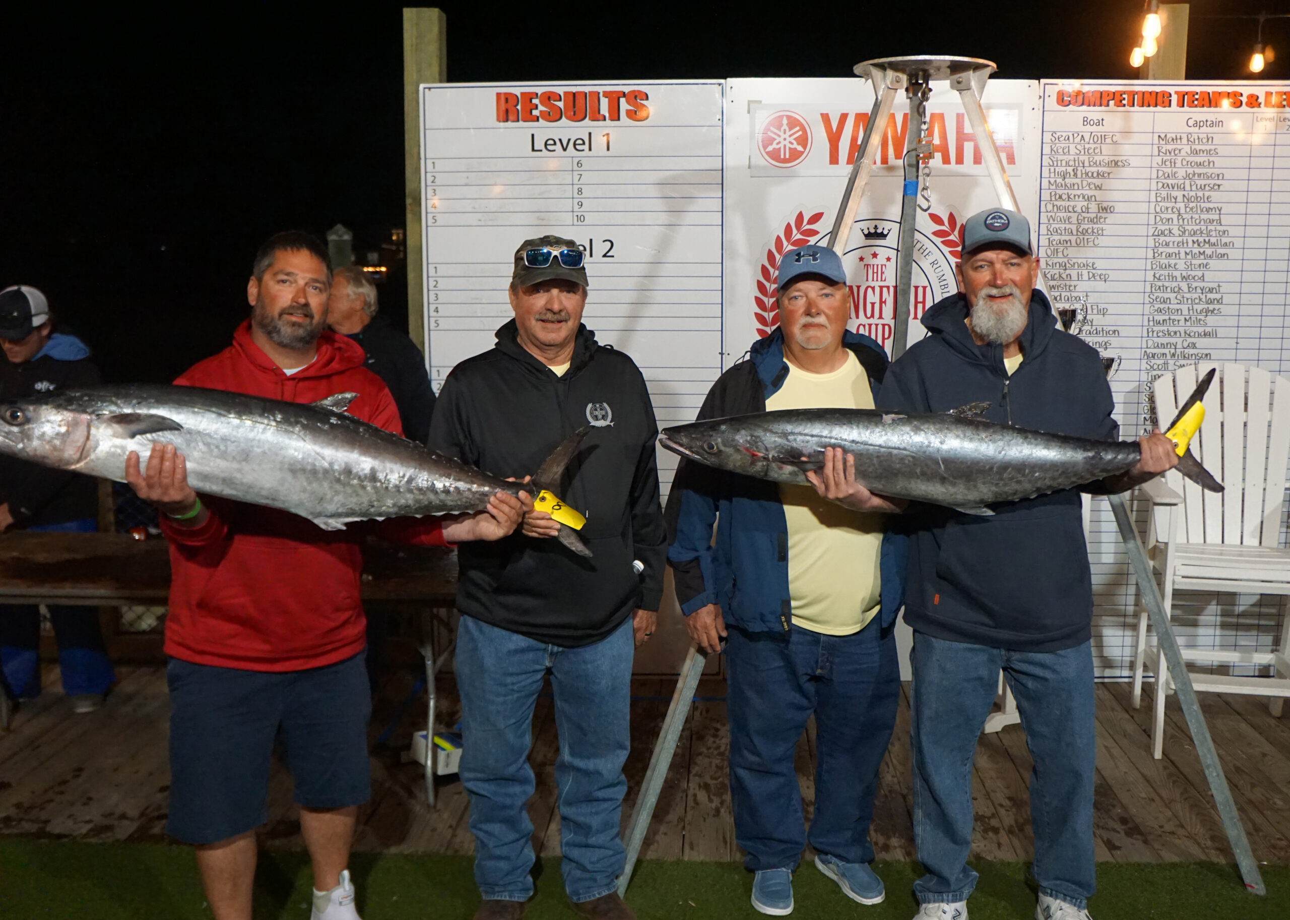 Travis Ackerman, Don Pritchard, Benny Moffitt, and Kenny York (l-r), of Team Wave Grader, with the two kings that secured their first‑place finish in the 2025 Kingfish Cup Championship. The crew’s 33.70 lb. and 33.45 lb. catches combined for a 67.15 lb. aggregate and earned them $109,685.