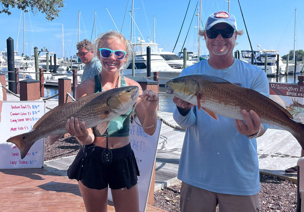 Camille and Rennie Clark, of Team Nautic Charge Batteries, with the two red drum that earned them second place on the leaderboard (7.49 lbs.) and second place in the Two Red Drum TWT (14.47 lbs.) in the 2025 Southport Inshore Challenge.