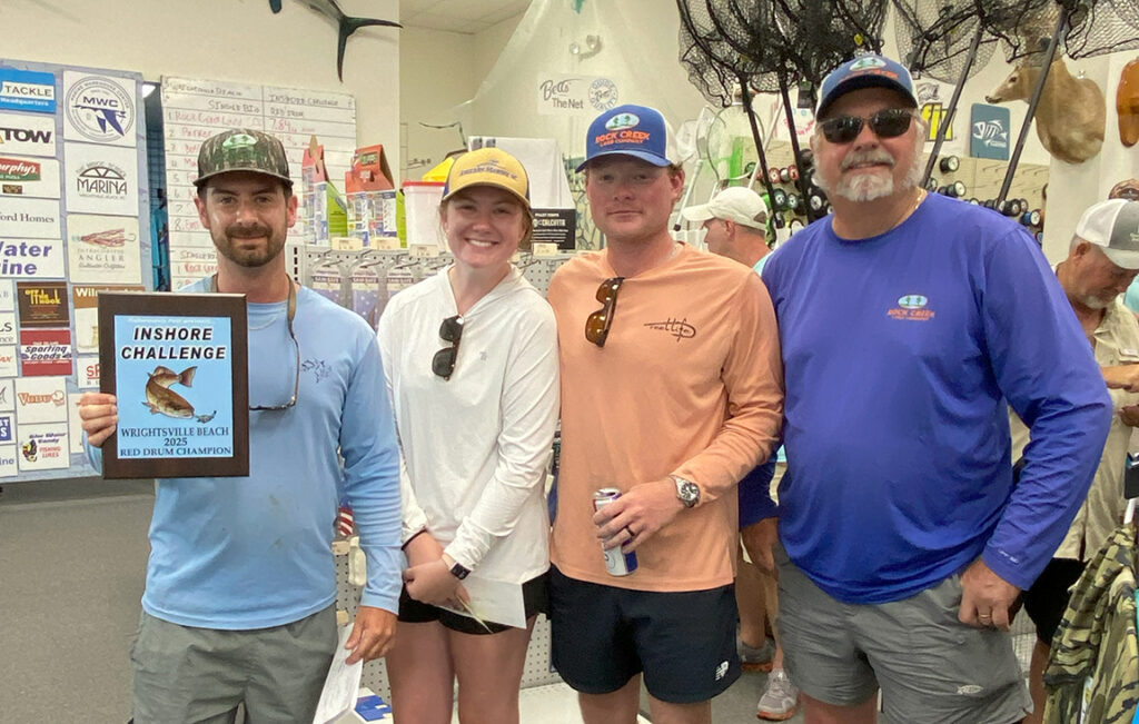 Rock Creek Land Company (Jonathan Lanier, Amanda Lynch, Logan Lynch, and Marty Lanier) was the overall winner in the 2025 Wrightsville Beach Inshore Challenge. They found a 7.84 lb. red drum on an oyster rock in a creek using cut menhaden on a Carolina rig.
