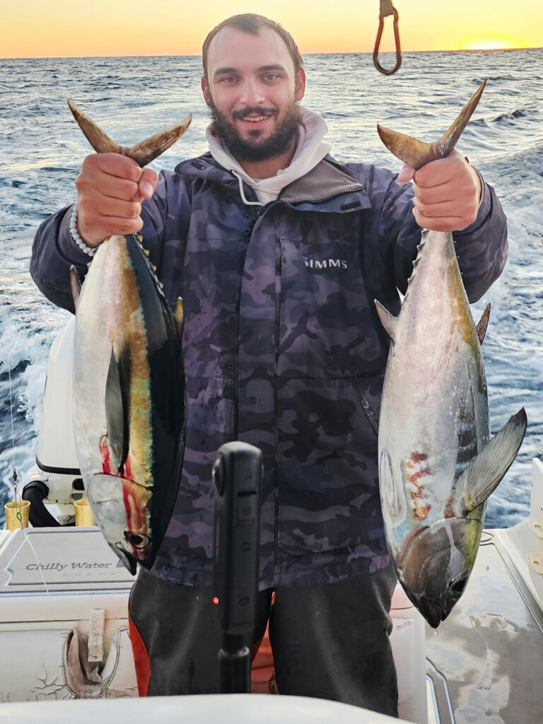Ty Costello, of Cherry Grove, doubled up on blackfin tuna on a sunrise bite at the Scarp. He was pulling cedar plugs with Capt. Bevan Hunter of Chilly Water Fishing.