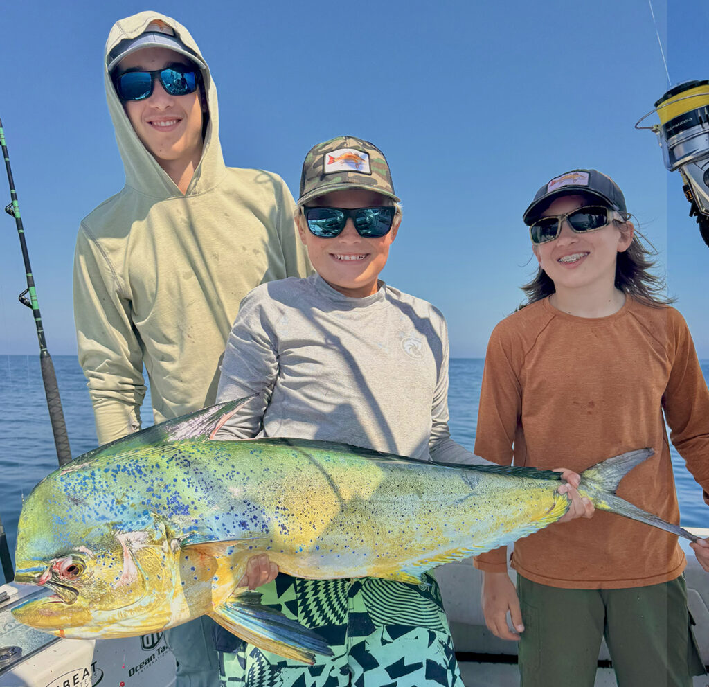 Grayson and Ryeland McCormack, of Virgina, and John Koenig, of Kitty Hawk, caught this mahi east of Oregon Inlet while trolling a SLC lure. They were fishing with Capt. John Berquist of Drumbeat Charters.