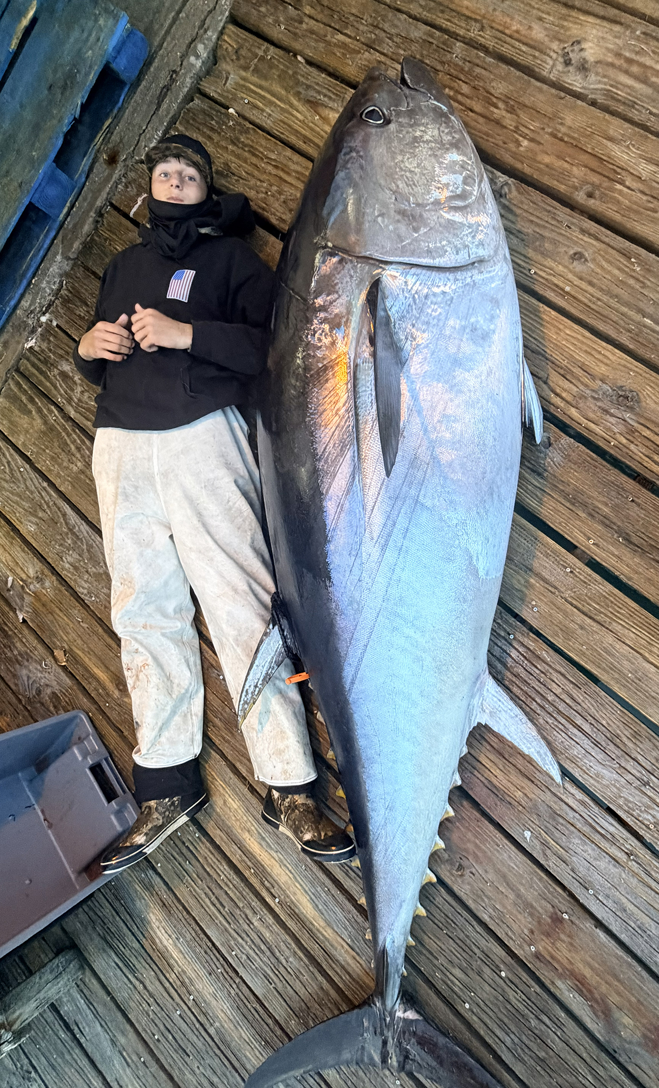 Maddox Tennant, of Bald Head Island, landed this 97″ bluefin tuna offshore of Holden Beach on a live pogie.