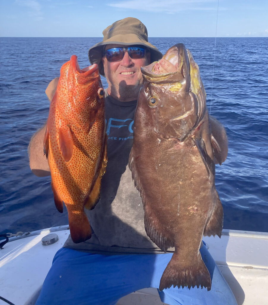 Tom Janke, of Supply, hooked this 7.5 lb. strawberry grouper and 16 lb. yellowmouth grouper in 150’ of water offshore of Shallotte Inlet using live cigar minnows.