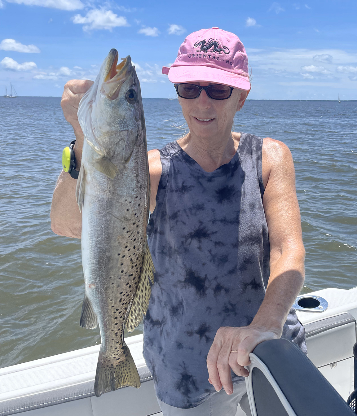 Speckled trout are being caught along the river shorelines, though this is an early morning bite that shuts down as the heat settles in. These 16-20” fish are mostly hitting artificials such as topwater plugs and soft plastics. Trout are also out over deeper structure in the sound for anglers working artificials lower in the water column.
