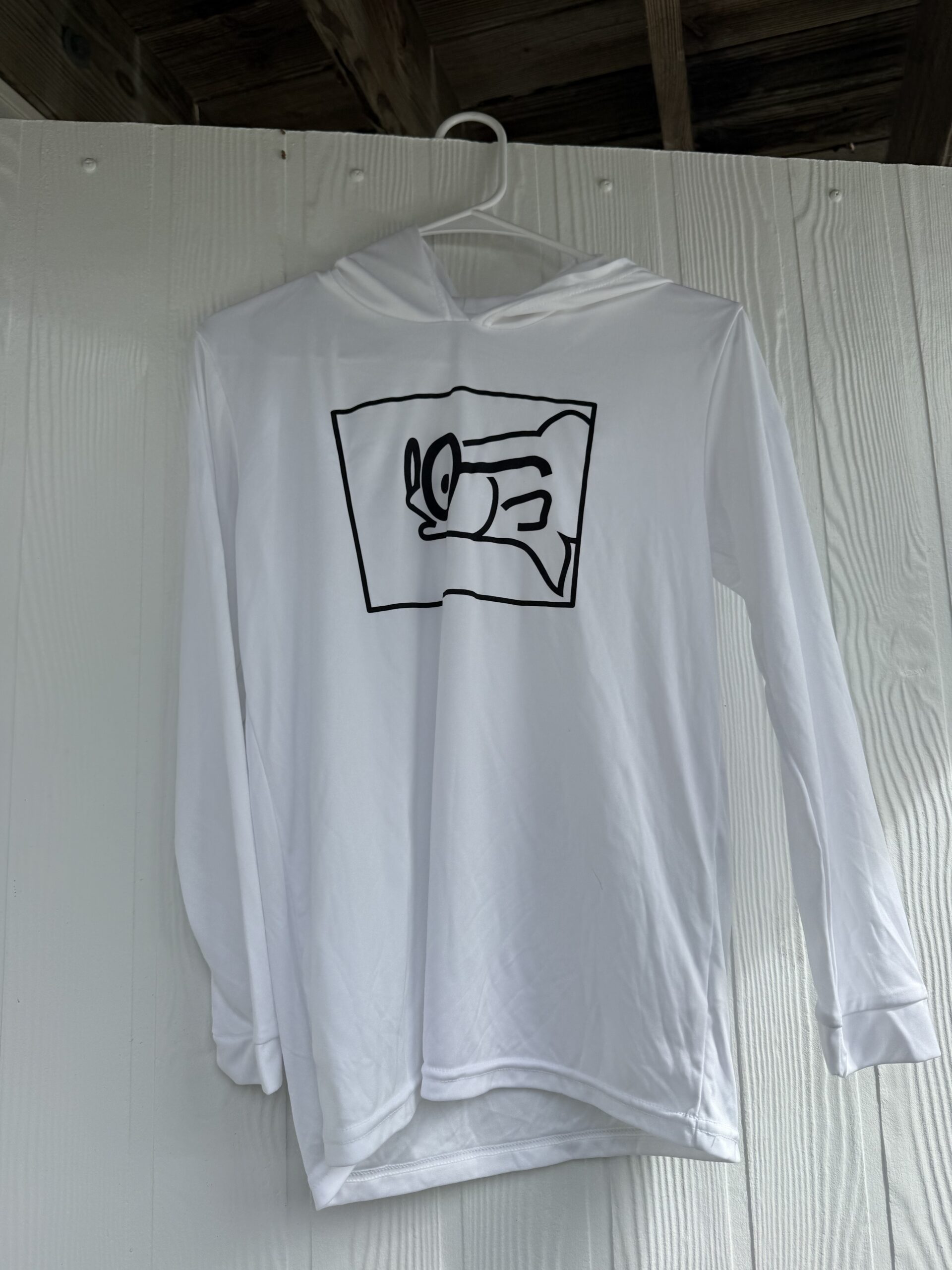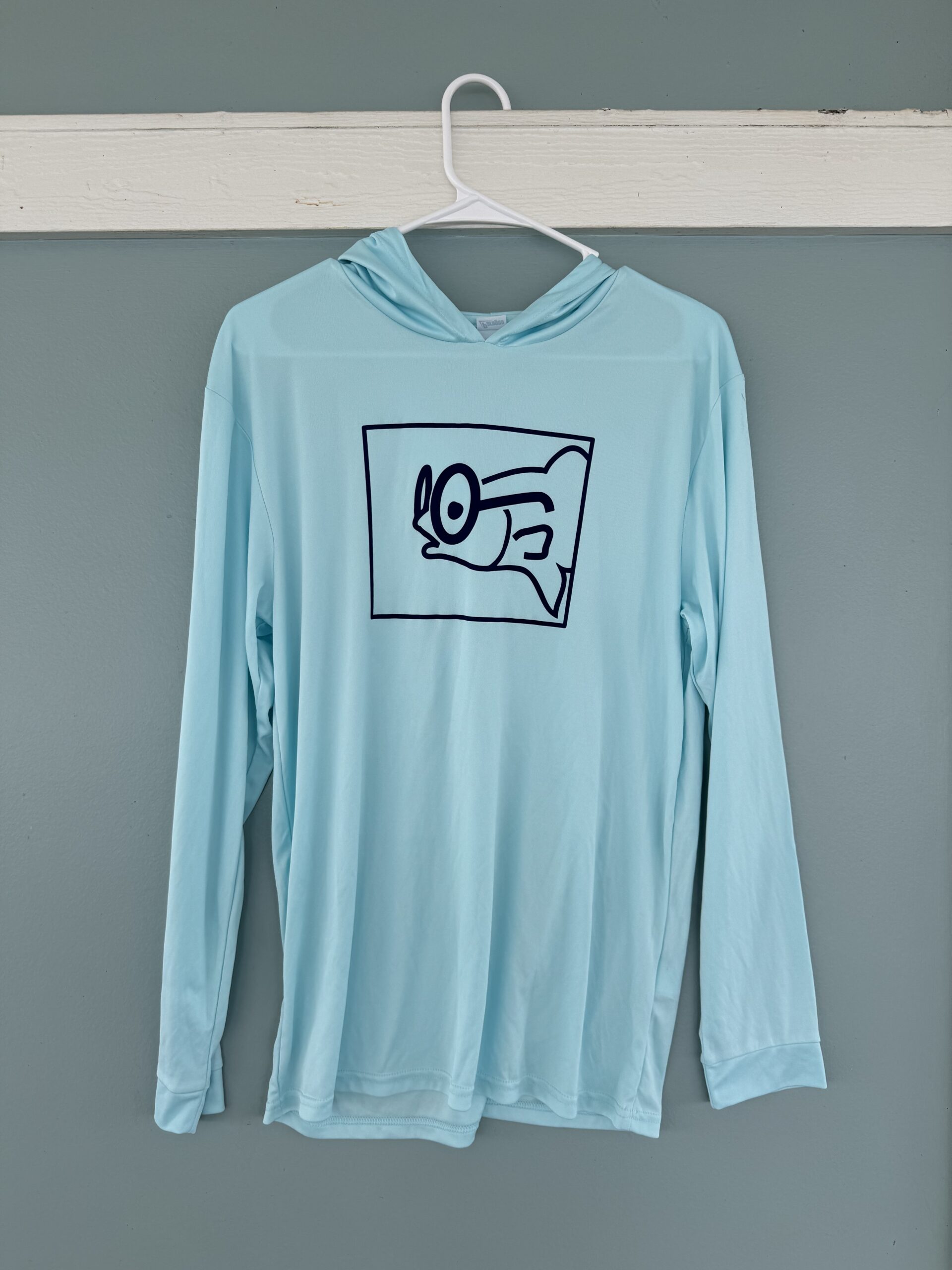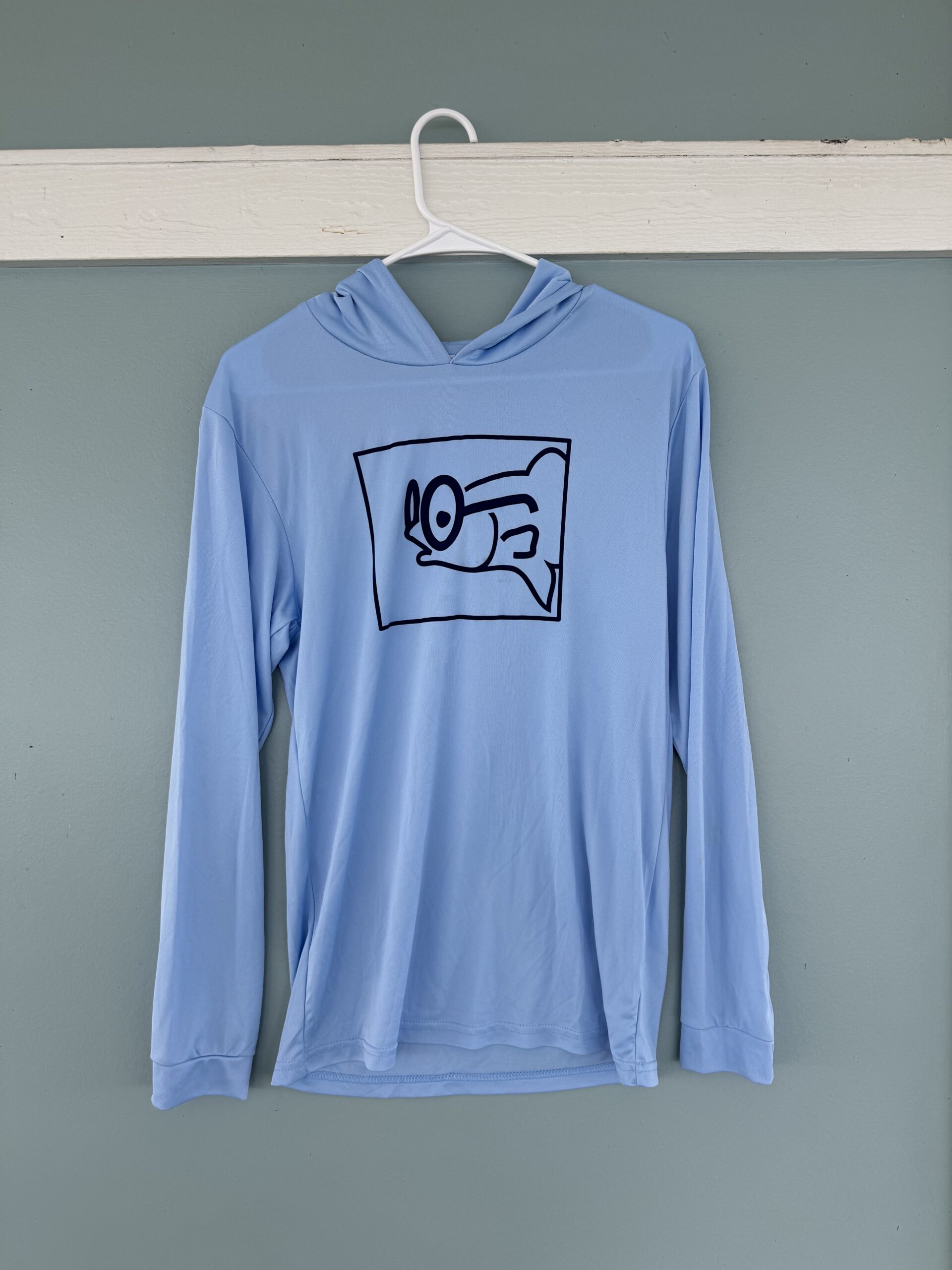 No clingy long sleeve spf shirts for Fisherman’s Post–these hooded spf shirts feel more like an extremely light, comfortable t-shirt.