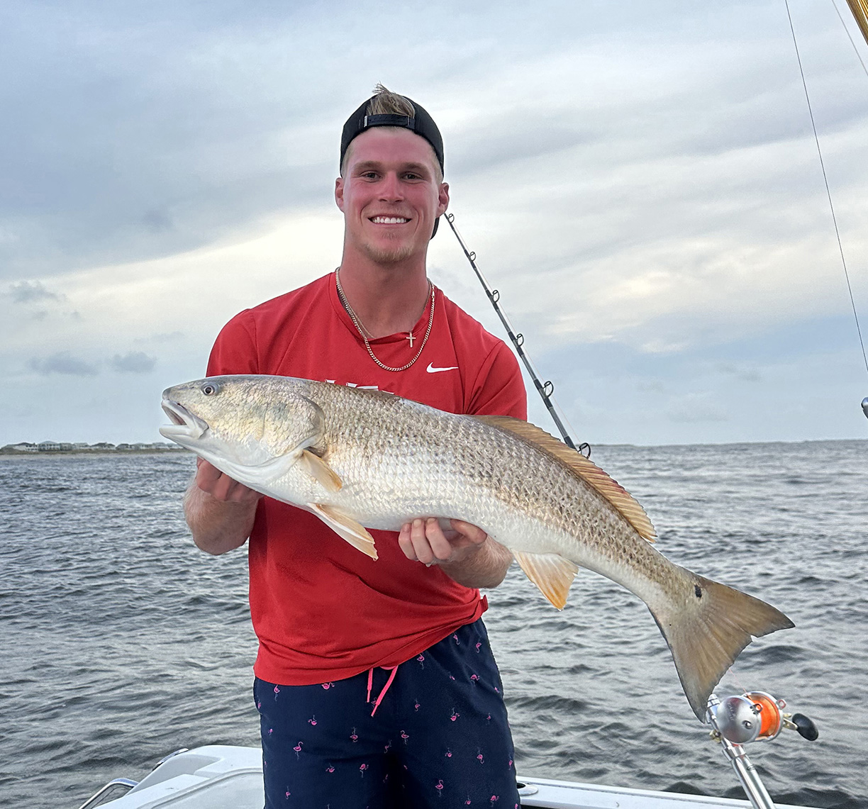 Walker Jenkins, of Oak Island, caught this 35” red drum at the “Hot Hole” off Oak Island on a pogie.