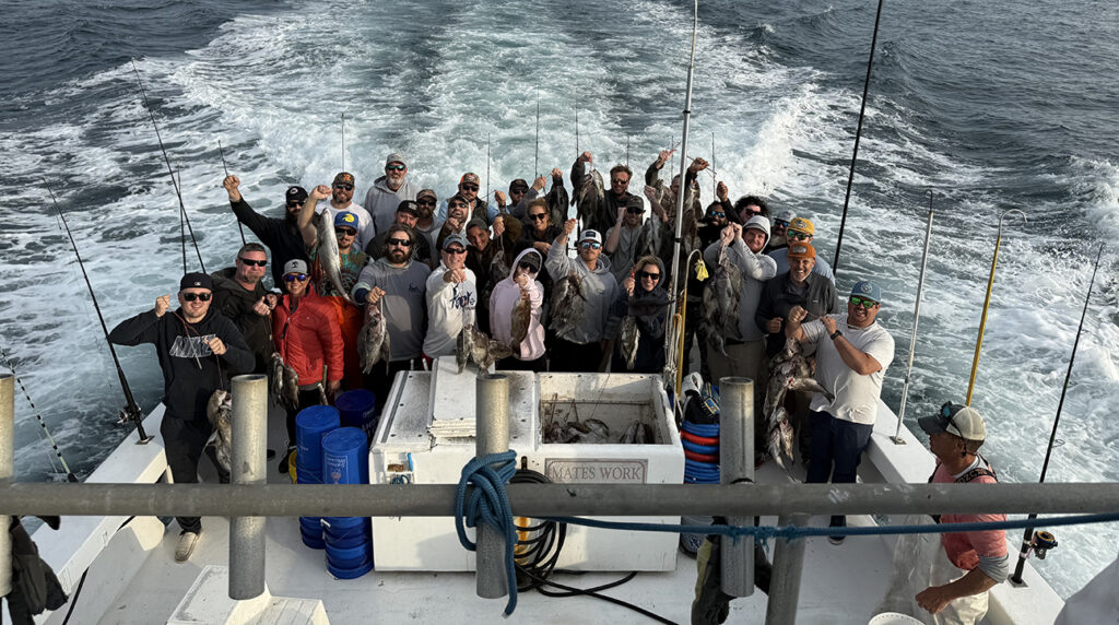 The crew of the 2025 Fish Post Day on the Vonda Kay pose on the way in with some of the stringers they put together while fishing 80-feet of water out of Carolina Beach Inlet with Capt. Dave Gardner. The catch was largely black sea bass but also included scamps, triggers, grunts, cobia, and kings, as well as (released) gags, flounder, and American reds.