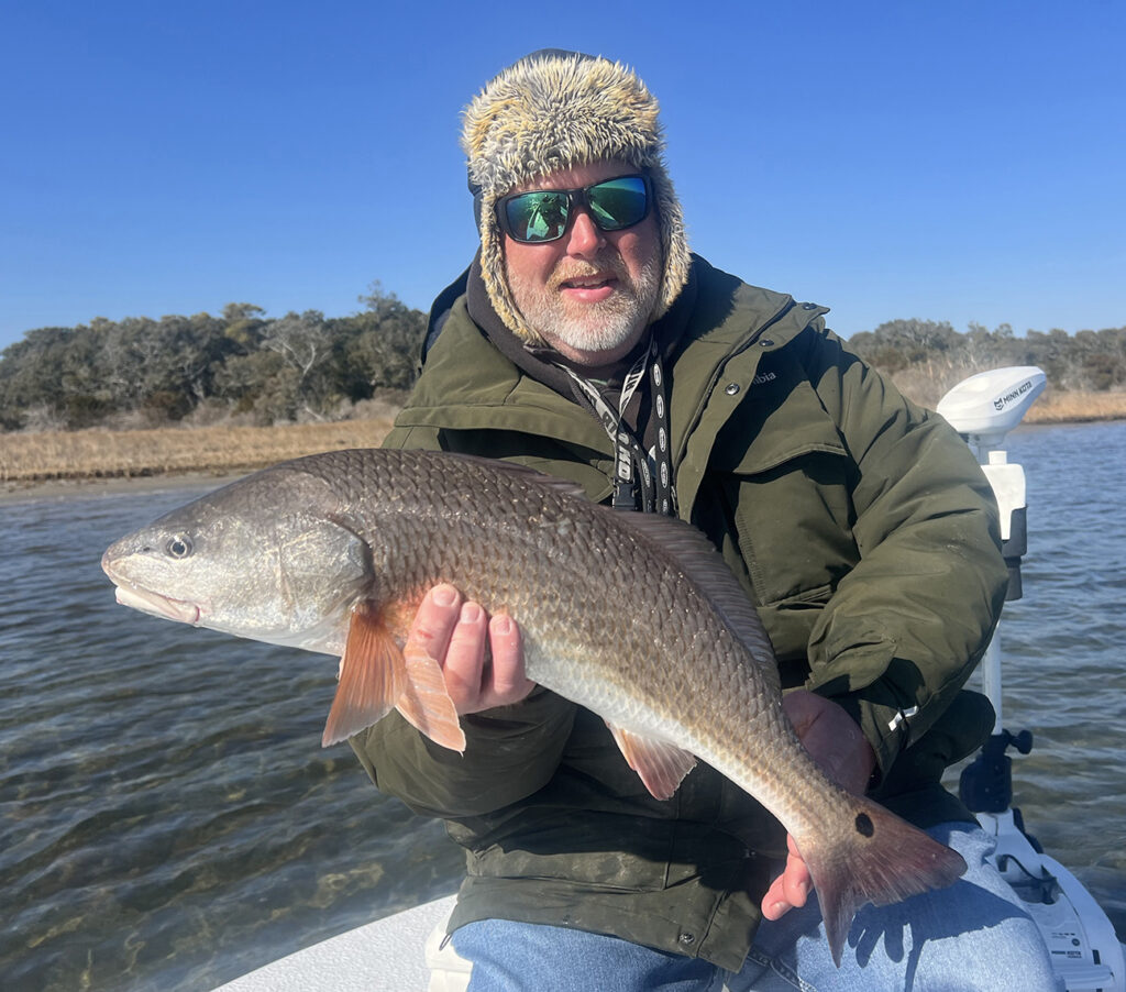 Capt. Allen Jernigan, of Breadman Ventures Guide Service, with an upper-slot redfish caught sight casting in a Topsail-area shallow bay with water temps in the mid-40s.