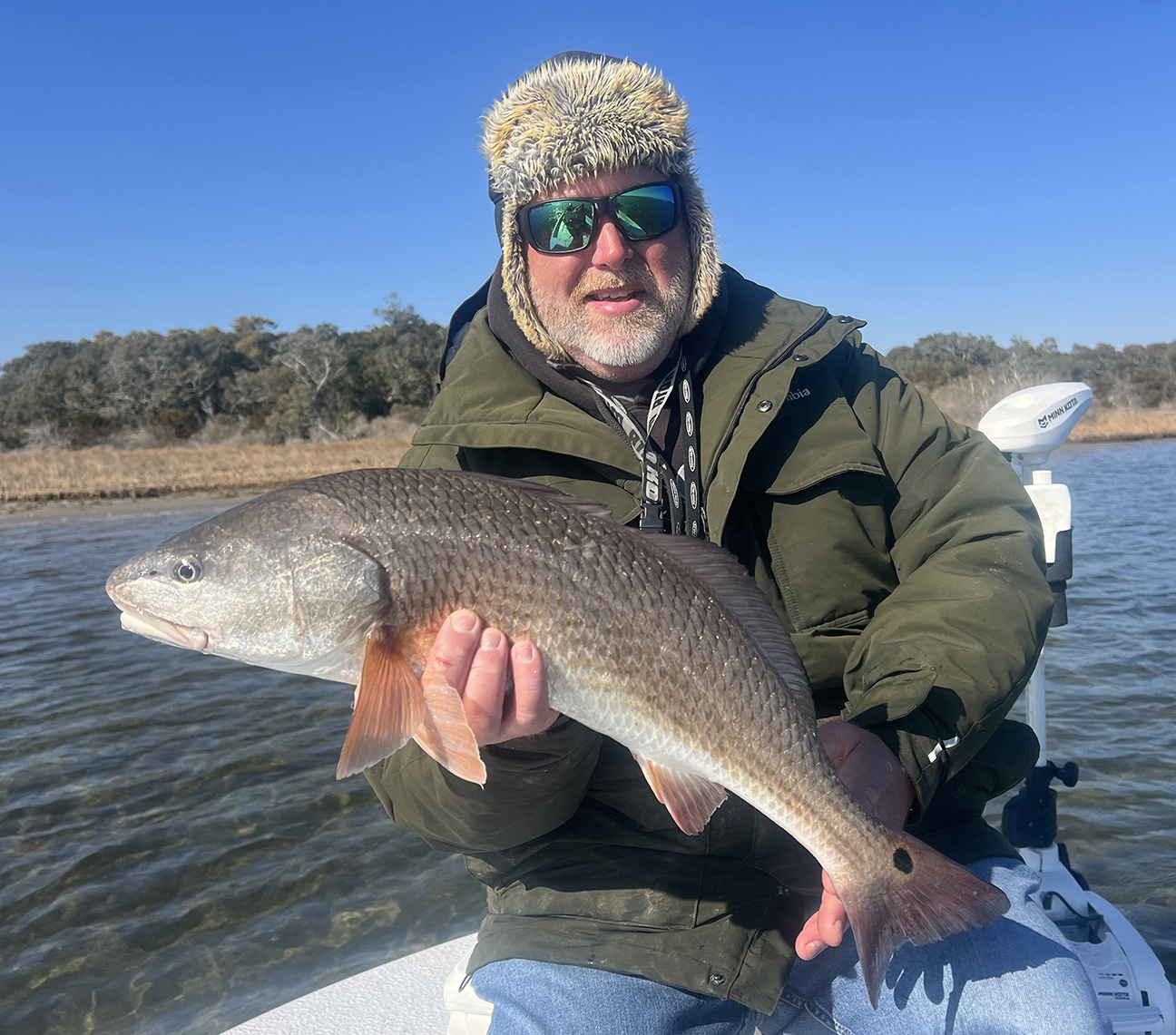 The near low tide meant that the majority of the bay was mostly 12-14 inches deep and the fish could be anywhere, so Allen put down the trolling motor and we began a zigzagging approach. While the water was clear, ripples on the water from the wind, combined with a winter sun that didn’t seem to be very bright even though there wasn’t a cloud in the sky, made visibility challenging.