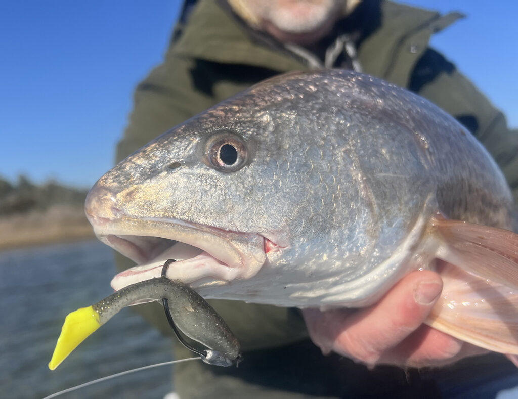 A Saltwater Assassin 4-inch sea shad in the “Momma’s Chicken” color hangs from the mouth of a redfish that Capt. Allen Jernigan pulled from a school of roughly 50 fish that were holding motionless in 14-inches of water.