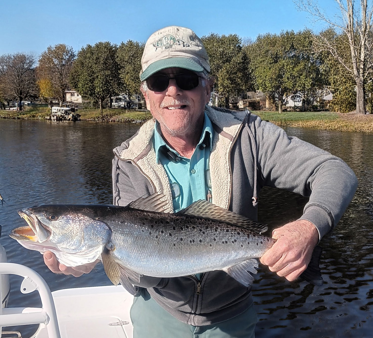 Fred Pope, of Jacksonville, with a 28″ speckled trout that hit a subsurface hard bait in the New River. He was fishing with Capt. John Parks of Early Riser Charters.