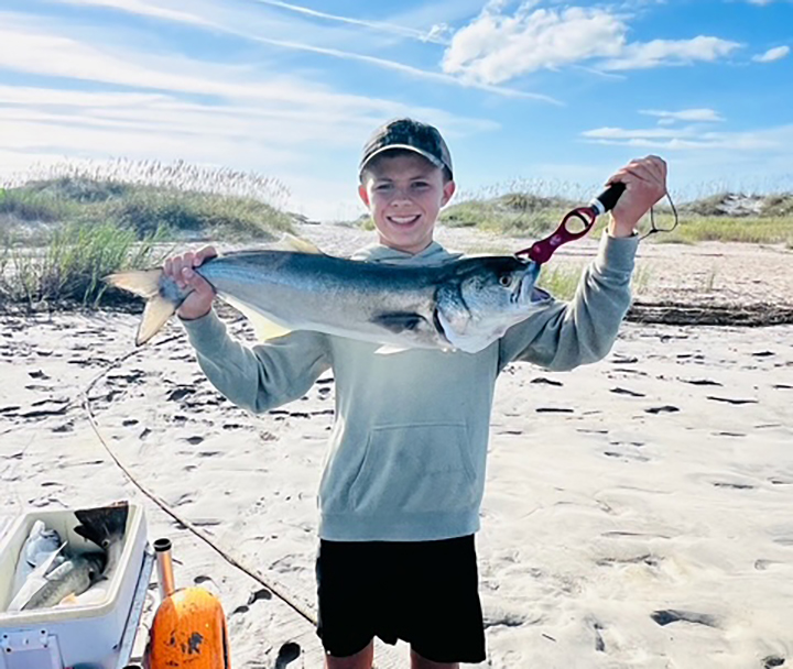 Thomas Helms, of Surf City, landed this 28″ bluefish from the surf at south Topsail Island on a live finger mullet.