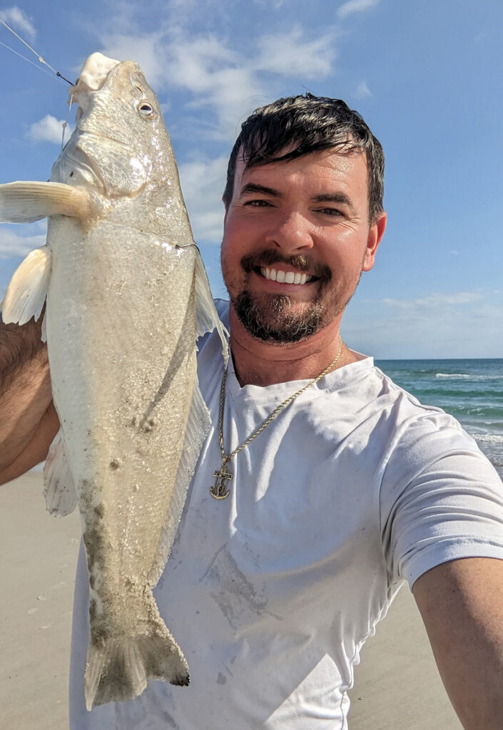 Derek Kelly, of Wilmington, with a 2.5 lb. whiting caught from the Wrightsville Beach surf using live sand fleas.